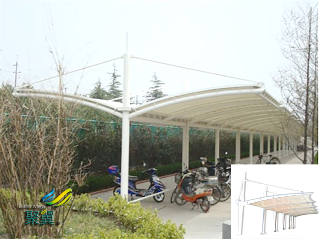 如今許多膜結構車棚遮陽雨篷設計獨特,新穎別致,一篷多用!膜結構車棚防雨、遮陽、擋風、擋風沙。多款電動車、摩托車、自行車都適合安裝。讓普通電動車享受“轎車”的時尚,膜結構車棚成為了靚麗城市風景。