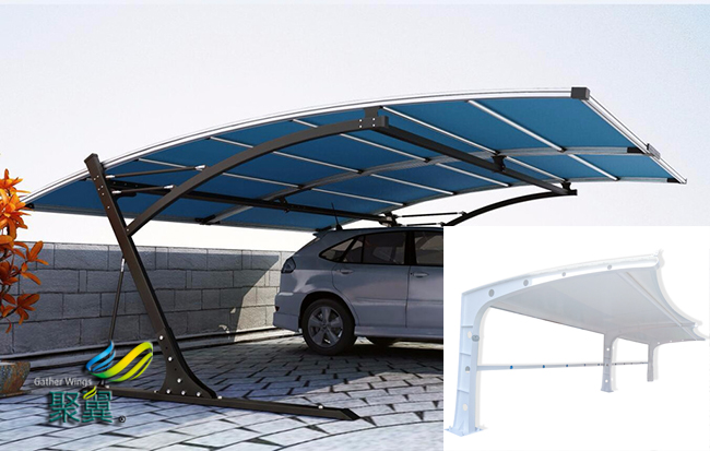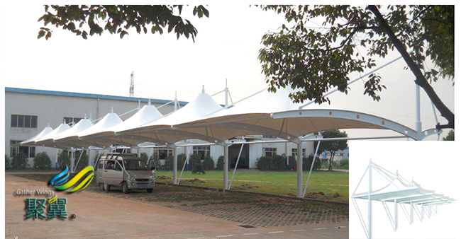 膜結構車棚PVC膜材一般采用表面涂層的處理方法把容易揮發的添加劑密封在膜結構車棚膜材體內,以此保持膜結構車棚PVC的柔韌性,增強壽命。
