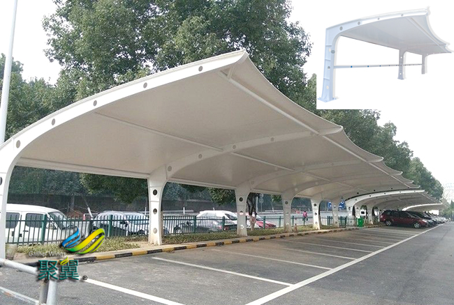 根據結構形式的不同,膜結構車棚結構可分為3類:骨架式膜結構、張拉式膜結構。骨架式膜結構是在鋼架或其他材料的骨架上鋪裝膜材料,由此構成膜結構車棚棚頂或外墻壁的構造形式。