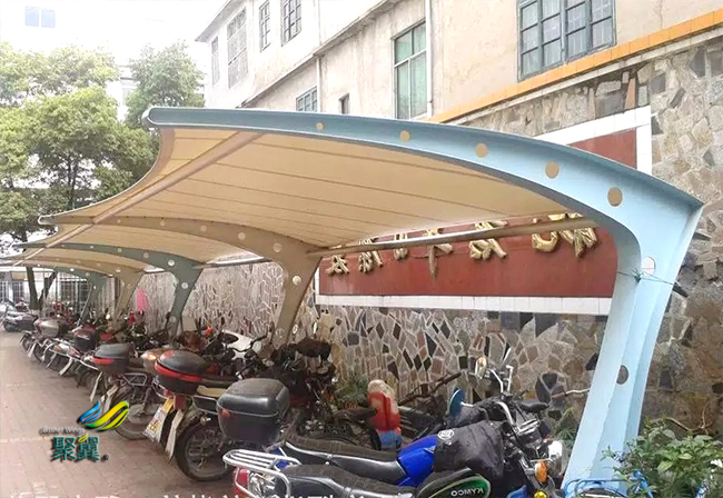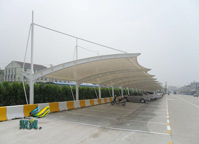 膜結構車棚表面共擠層具有化學吸收紫外線并轉化為可見光。對植物光合作用有良好的穩定效果(極適合保護各類車、貴重藝術品及展品,使膜結構車棚不受紫外線破壞)。