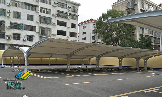 膜結構車棚工程技術:鋼結構及索膜結構施工對膜面材料質量控制,膜結構車棚工程膜面采用的主要有是聚四氟乙烯涂面PVC聚酯纖維類薄膜和玻纖薄膜,該膜結構車棚材料國際上僅有少數幾家公司生產。