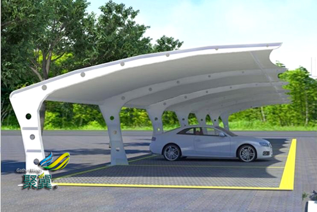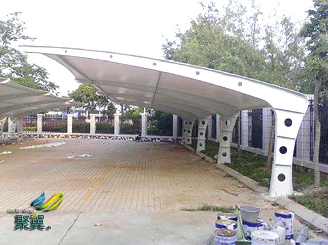 膜結構車棚采用膜材的特性是其常用膜材為聚酯纖維覆聚氯乙烯(PVC)和玻璃纖維覆聚聚四氟乙烯(PTFE)。膜結構車棚PVC材料的主要特點是強度低、彈性大、易老化、徐變大、自潔性差,但膜結構車棚價格便宜,容易加工制作,色彩豐富,抗折疊性能好。為改善其性能,可在膜結構車棚表面涂一層聚四氟乙烯涂層,提高膜結構車棚抗老化和自潔能力,其壽命可達到15年左右。