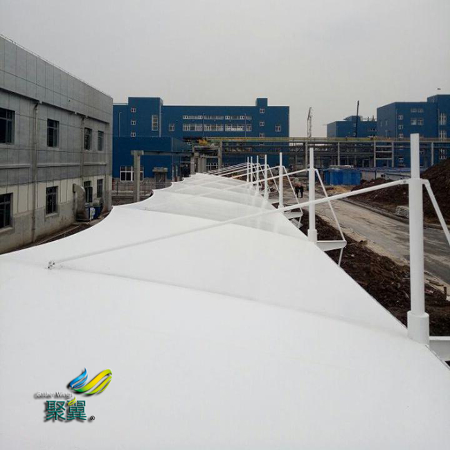 膜結構車棚防污自潔性是所有建筑膜材中最好的,但柔韌性差,施工較困難,成本也十分驚人。膜結構車棚其加工方法是把玻纖織物多次快速放入特氟隆熔體中,使織物兩面皆有均勻的特氟隆涂層,使永久性的膜結構車棚正式誕生。
