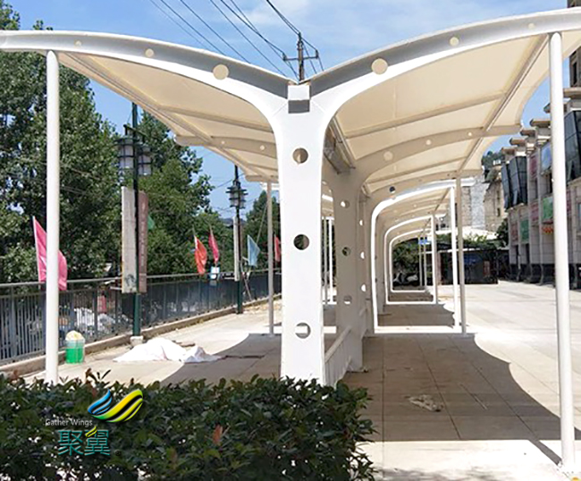 自潔性,膜結(jié)構(gòu)車(chē)棚的自潔性主要是膜材料表面加涂了防護(hù)層,防護(hù)層主要是聚氟乙烯、丙烯酸等構(gòu)成可耐高溫,不會(huì)發(fā)粘,從而在落到膜結(jié)構(gòu)車(chē)棚膜材料的灰塵可依靠雨水或者自然風(fēng)來(lái)達(dá)到自潔的特性。