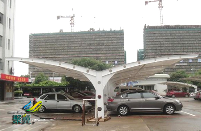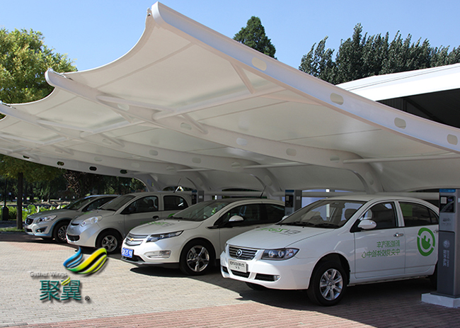 膜結構車棚與以往的舊式車棚相比,結構更加輕盈,而且在使用中比較穩固。膜結構車棚的材料使用了高分子膜結構車棚材料和支撐構件共同組成,并且能根據支撐構件的高低位置不同而呈現不同的形狀。因此在教育,商業,體育館等公共場所都有很廣泛的應用。