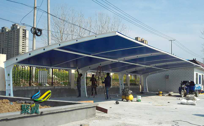 膜結(jié)構(gòu)車棚安裝過程中不應發(fā)生雨水積存現(xiàn)象。同時應根據(jù)降雨的程度決定工程的中止和繼續(xù)。