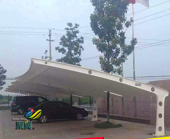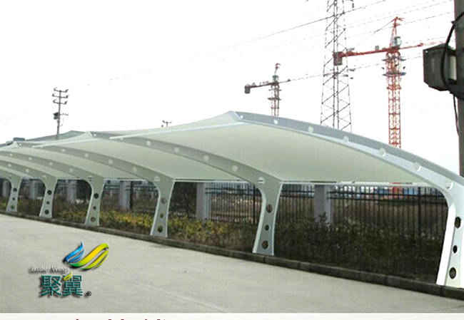 膜結構車棚的透光性好,膜材的外表有防紫外線的共擠層,可防止太陽紫外線引起的樹脂疲勞變黃。外表共擠層具有化學吸收紫外線并轉化為可見光。