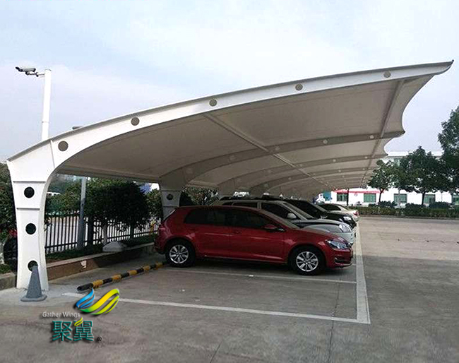 膜結構車棚材料和輔助之間通過一定方式使膜結構車棚內部產生張力,在形成的力的控制下形成某種空間形狀,作為覆蓋結構或者建筑物主體,這種窄間結構類型具有足夠剛度來抵抗外部荷載作用。