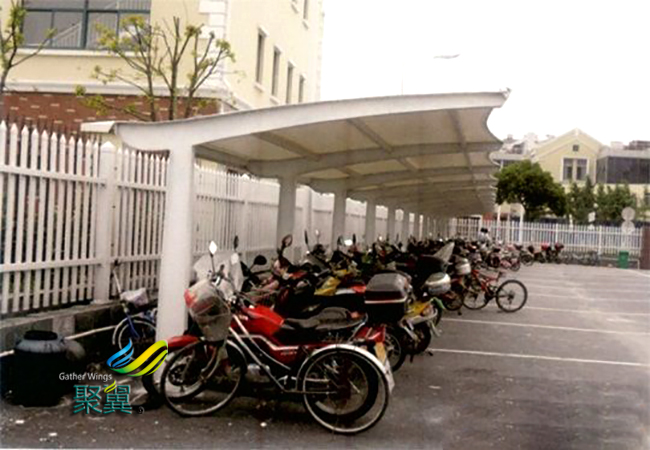 雨棚多為白色,膜結構車棚很有現代感,不僅有著很高的技術含量還有相當程度的藝術感染力,膜結構車棚曲面具有很強的塑造性,能夠根據需要進行任意變化,設計師可根據整體環境進行設計,膜結構車棚建造出具有代表性的形象工程。