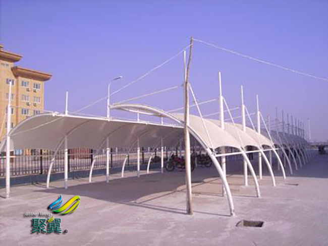 膜結(jié)構(gòu)車棚是一種新式的建筑構(gòu)造,通常來說是專門用于防治自行車被陽光暴曬或者是被雨水淋濕的一種防護(hù)性構(gòu)造。膜結(jié)構(gòu)車棚自行車棚不只具有美麗的外觀、特性的外型并且其功用也對比突出,膜結(jié)構(gòu)車棚是城市綠色化建造的一大輔佐。