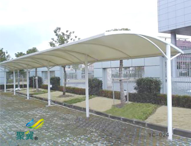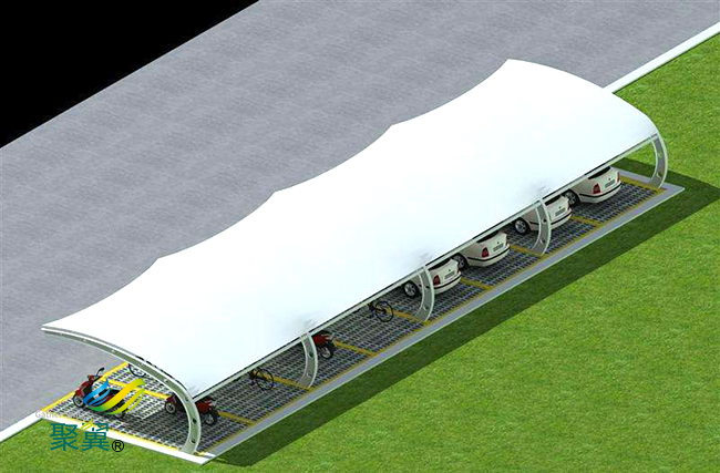 膜結構車棚自行車棚不只具有美麗的外觀、特性的外型并且其功用也對比突出,膜結構車棚是城市綠色化建造的一大輔佐。