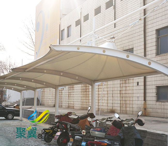 在強烈的陽光下,不會產生燃燒的效應,膜結構車棚能夠遮風擋雨的特性,是其他的材料所無法比擬的,很多大的設備廠家或者是企業之所以選擇這種膜結構車棚材料是因為材料的優越性。