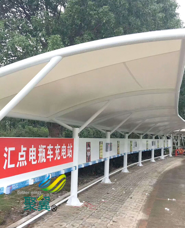 膜結(jié)構(gòu)車棚自行車棚主要是由兩部分構(gòu)成,主體由鋼構(gòu),膜結(jié)構(gòu)車棚頂部由膜布(張拉膜)/PVC,正是因為這樣的結(jié)構(gòu),讓膜結(jié)構(gòu)車棚在美觀度上可以很好的適應,同進它的使用時間也最長,像這種骨架的最長壽命可以達到三十年以上。