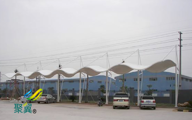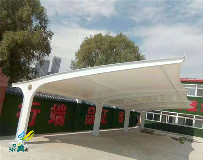 膜結構車棚PVC材料的主要特點是強度低、彈性大、易老化、徐變大、自潔性差,但膜結構車棚價格便宜,容易加工制作,色彩豐富,抗折疊性能好。