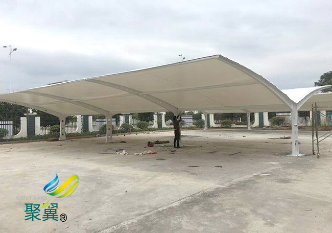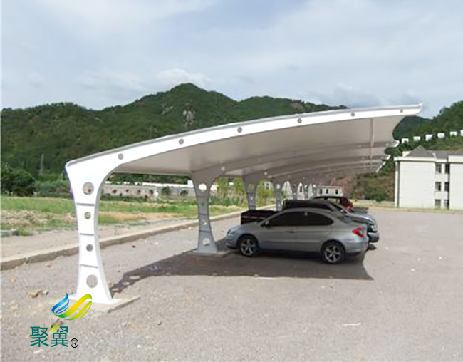 膜結構車棚防火性與抗震性,膜結構建筑所采用的膜材具有卓越的阻燃性和耐高溫性,故能很好的滿足防火要求。由于膜結構車棚結構自重輕,又為柔性結構且有較大變形能力,故抗震性能好。