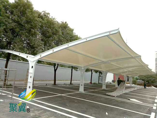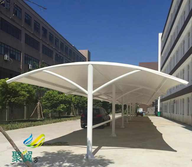 膜結構車棚是提供給車輛停泊的地方,使車輛避免了風吹雨打。來保護自行車,汽車等不受損傷。這些膜結構車棚都是采用金屬構件來制作,因此具有笨重,形式單調的缺點,沒有個性和美觀。