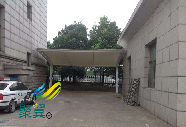 膜結構車棚表面有防紫外線的共擠層,可防止太陽紫外線引起的樹脂疲勞變黃。膜結構車棚表面共擠層具有化學吸收紫外線并轉化為可見光。