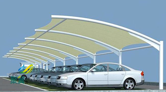 膜結構車棚耐候性:表面有防紫外線的共擠層,可防止太陽紫外線引起的樹脂疲勞變黃。膜結構車棚表面共擠層具有化學吸收紫外線并轉化為可見光。對植物光合作用有良好的穩定效果(極適合保護各類車、貴重藝術品及展品,使其不受紫外線破壞)。