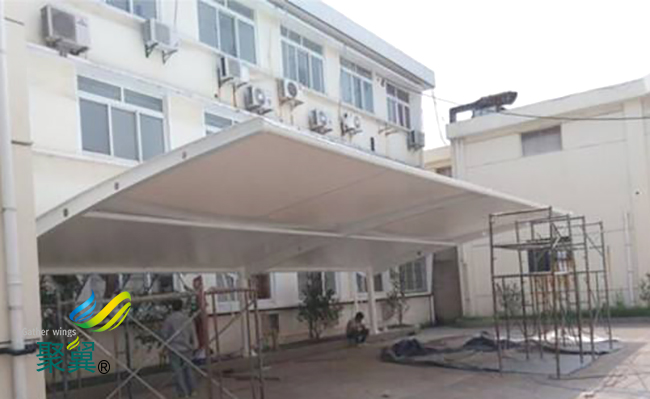 膜結構車棚面層,保護基材免受紫外線侵蝕并使膜結構車棚膜材具有自潔性的表面附加涂層。膜結構車棚預張力,以機械或其他方法,預先施加于拉索或膜片上的力。