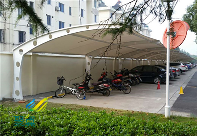 膜結構車棚與以往的舊式車棚相比,結構更加輕盈,而且在使用中比較穩固。 如果是采用的聚碳酸酯材料作為頂棚的話,采用螺栓固定。相對于膜結構車棚來說,整體能承受的載荷會小很多, 遇到劇烈的暴風雨天氣,膜結構車棚頂棚會和支撐件分離。 膜結構車棚未出現之前,市場主要的是鐵制車棚,鋁合金車棚,彩鋼車棚等。這些膜結構車棚都是采用金屬構件來制作,因此具有笨重,形式單調的缺點。