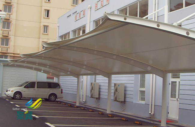 膜結構車棚具有自潔性,膜結構車棚的自潔性主要是膜材料表面加涂了防護層,膜結構車棚防護層主要是聚氟乙烯、丙烯酸等構成可耐高溫,不會發粘,從而在落到膜結構車棚膜材料的灰塵可依靠雨水或者自然風來達到自潔的特性。