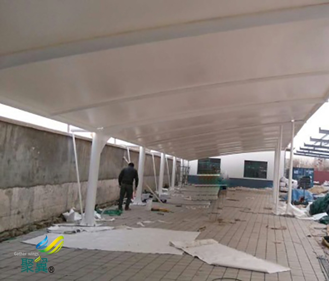 其中骨架式膜結構車棚是在鋼架或是其他材料的骨架上鋪裝膜材料的,以便能夠構造出不同形式的膜結構車棚。