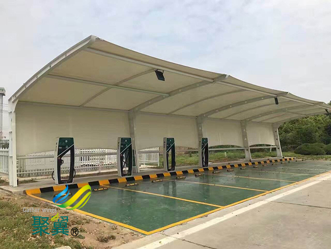 膜結(jié)構(gòu)車棚工期短:膜材裁剪。拼合成型及骨架的鋼結(jié)構(gòu)、鋼索均在工廠加工制作,現(xiàn)場只需組裝,施工簡便,故施工周期比傳統(tǒng)建筑短。