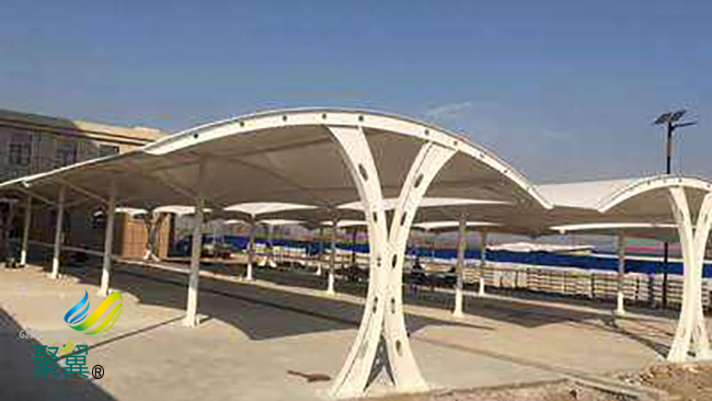 經(jīng)濟性,由于膜結(jié)構(gòu)車棚膜材具有一定的透光率,白天可減少照明強度和時間,能很好地節(jié)約能源。同時夜間彩燈透射形成的絢爛景觀也能達到很好的廣告宣傳效益。膜結(jié)構(gòu)車棚膜建筑屋面重量僅為常規(guī)鋼屋面的1/30,這就降低了墻體和基礎(chǔ)的造價。