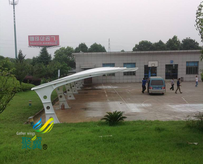 膜結構車棚整體框架采用方鋼焊接成型龍骨架,框架整體做防銹處理,刷防銹底漆三遍,表面噴涂白色汽車漆,膜結構車棚主立柱一般采用220mm鋼管或工字鋼作停車棚的支撐柱, 膜結構車棚身整體結構牢固抗震防風系數高,耐腐蝕。
