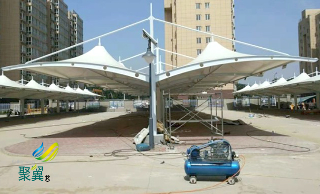 膜結構車棚由于其材料的特殊,拉伸和延展性很強,可以塑造出很多具有現代化和藝術性的建筑,將膜結構車棚自行車棚搭配組合,便成了一件藝術品,給人美的視覺享受,膜結構車棚豐富的新穎造型,潔白無瑕,讓人眼前一亮,回味悠長。 膜結構車棚耐用:公共自行車棚屬于棚外基礎建設,風吹雨打是避免不了的。而膜結構車棚膜材料具有高強度的特點,再加上張拉技術的應用,根據力學原因構造外圍,使得膜結構車棚自行車車棚的支撐力和強度遠遠高于其他材料。