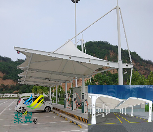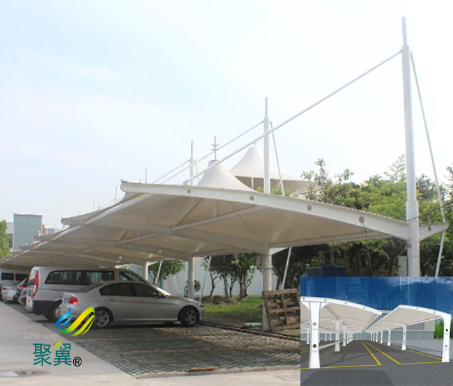 膜結(jié)構(gòu)車棚建筑所采用的膜材具有卓越的阻燃性和耐高溫性,故能很好的滿足防火要求。由于膜結(jié)構(gòu)車棚結(jié)構(gòu)自重輕,又為柔性結(jié)構(gòu)且有較大變形能力,故抗震性能好。