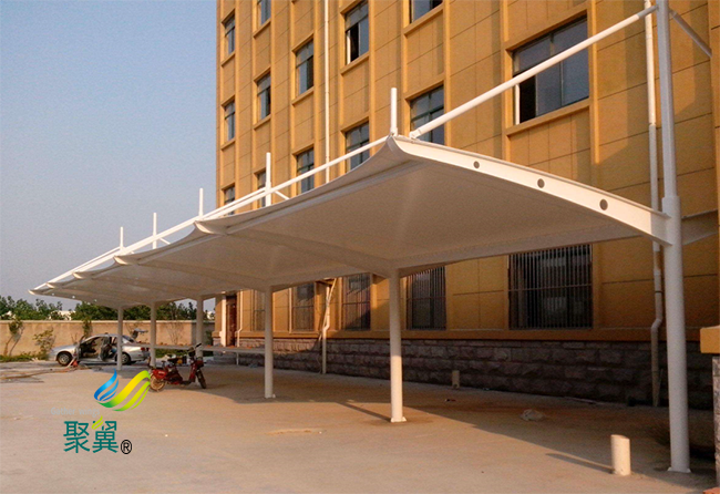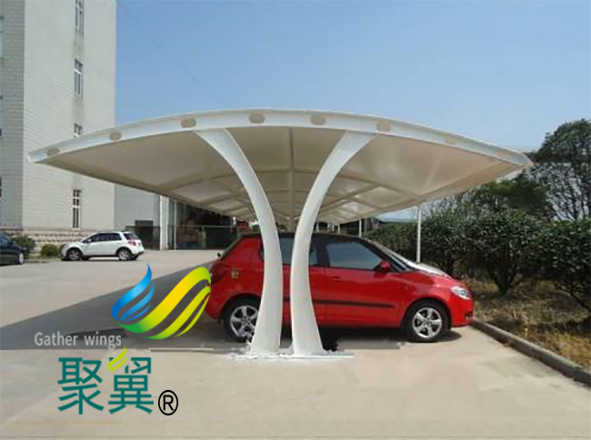 膜結構車棚膜材的使用可以減少空間用鋼量,減少二次污染,其施工現場減少沙、石料、鋼結構焊接等用量,施工現場要保持環保,同時汽車停車棚進現場后只需漲拉就位,施工速度很快。
