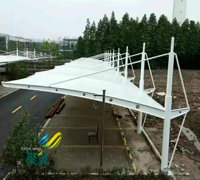 膜結(jié)構(gòu)車棚是由上面造型獨(dú)特的膜材質(zhì)和下面骨架的鋼結(jié)構(gòu)、鋼索組成的,現(xiàn)場(chǎng)裝置即可完結(jié)。