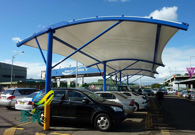 膜結構車棚具有良好的環保性、透光性、自清潔性,膜材表面采用PVDF(聚偏二氟乙烯)涂層、或二氧化鈦涂層,膜結構車棚具有較好的隔熱效果,對太陽熱能可反射掉70%,膜結構車棚膜材本身吸收了17%,傳熱13%,而膜結構車棚透光率卻在20%以上,經過10年的太陽光直接照射,其輝度仍能保留70%。