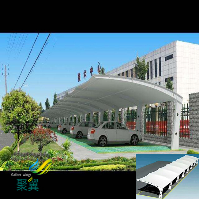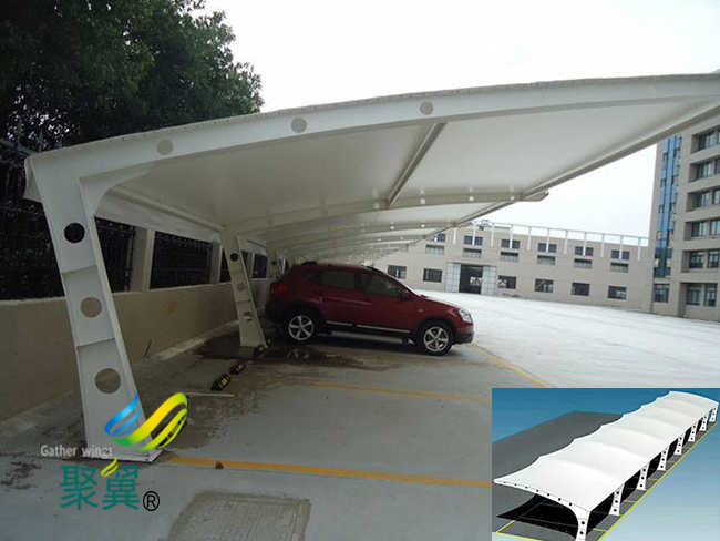 膜結構車棚PVC材料的主要特點是強度低、彈性大、易老化、徐變大、自潔性差,但價格便宜,容易加工制作,色彩豐富,抗折疊性能好。為改善其性能,可在膜結構車棚表面涂一層聚四氟乙烯涂層,提高膜結構車棚抗老化和自潔能力,其壽命可達到15年左右。