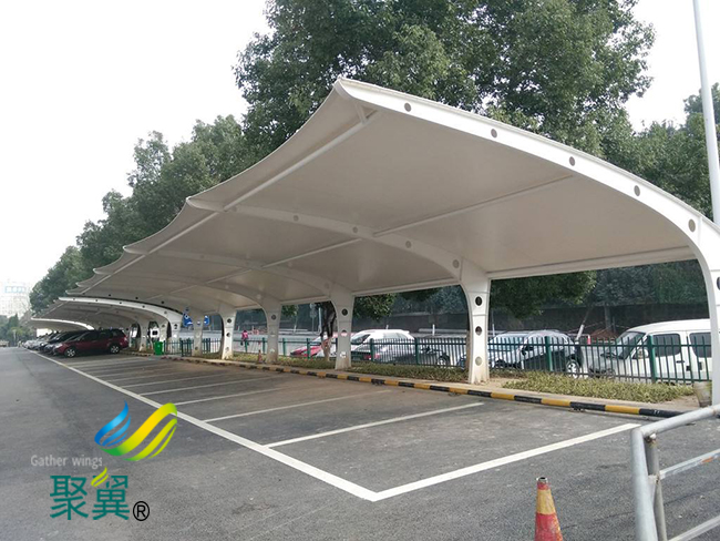 銅陵市膜結構車棚膜構造的支架構造是由高強度構架產生內部的伸拉才能,構成一定的外形,作為掩蓋構造,膜構造銅陵市膜結構車棚能滿足車輛車風擋雨需求,也能有效的維護車輛起到減緩車輛老化速度的功用。