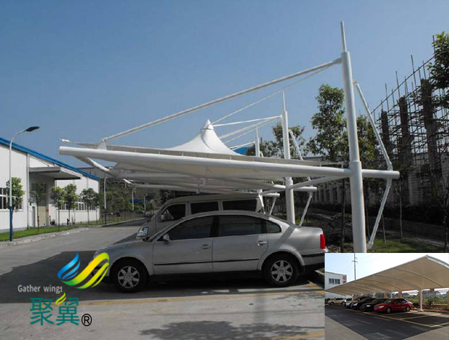 膜結構車棚而且空間更加寬敞,但是其也有較為明顯的缺點,就是使用膜材較多,鋼構較為復雜,成本會比其他造型的車棚更高,一般用于對于造型有嚴格要求的場所,如商業街、景區、公司總部等等。