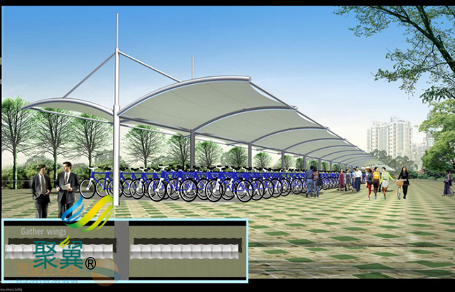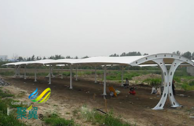 張拉鹿泉市膜結構車棚獨特,重量輕,富有時代氣息。 張拉膜結構也**適合制作街頭小品,如步行街雕塑、街上的綠色亭臺樓閣、廣場和公園的入口等,富有個性,***象征意義。