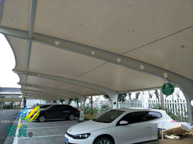 、積雪問題,而且空間更加寬敞,但是其也有較為明顯的缺點,就是使用膜材較多,鋼構較為復雜,成本會比其他造型的車棚更高,一般用于對于造型有嚴格要求的場所,如商業街、景區、公司總部等等。