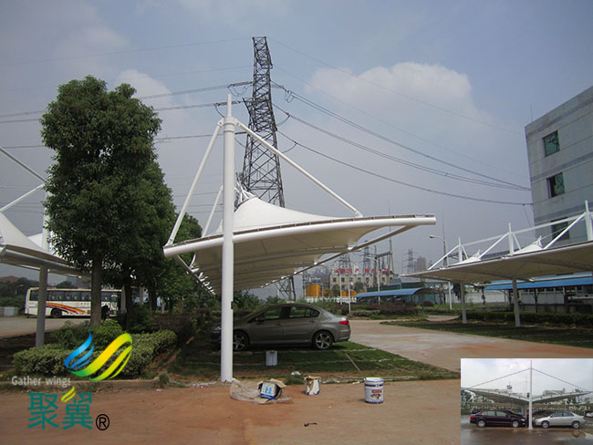膜結構停車棚立柱為三級變徑,立柱與拉桿連接處焊接耳板,通過螺栓連接, 膜結構停車棚大梁支撐部分采用數控金屬切割工藝,制作腹板、上下翼緣板,整體加工焊接制作,經過打磨,除銹,噴底漆,中間漆及面漆等多道工序制作完成停車棚主鋼構件在工廠制作完成。膜結構停車棚棚面材料使用上海ZZF膜材,是一種耐用、高強度的涂層織物,是在用纖維支撐的基布上涂敷樹脂或橡膠等高分子聚合物而制成,具有質地柔韌、厚度小、重量輕、透光性好、強度高等特點。