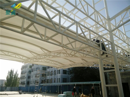 這種結構形式所采用的材料是高強度織物材料,經緯交織,雙面PVDF涂層,耐久性10年以上;且重量輕,相當于普通鋼結構屋面的1/10;所以能滿足大跨度的要求。