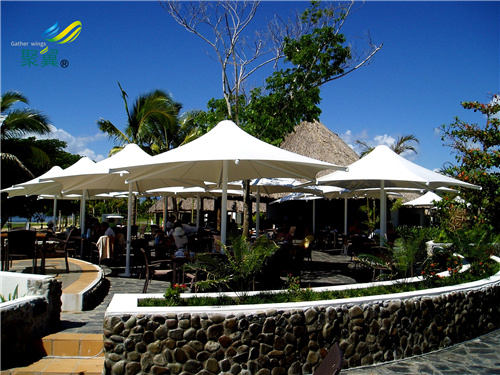 這種建筑以膜材、鋼索和支柱組成,利用鋼索與支柱在膜材中導(dǎo)入張力以達(dá)安定的形式。優(yōu)點具有結(jié)構(gòu)性能強且美觀的造型。不過由于這種張拉膜工程要求的施工精度很高,雖然后期維護費用不高,但是工程造價就高于骨架式膜結(jié)構(gòu)。