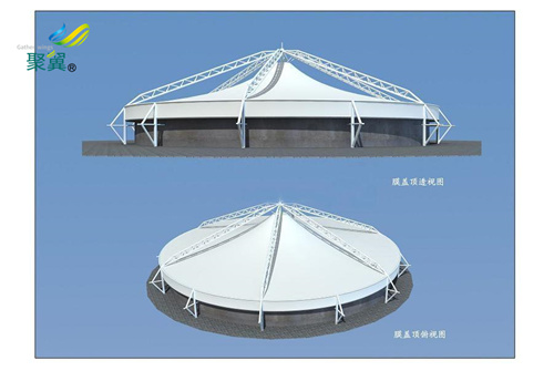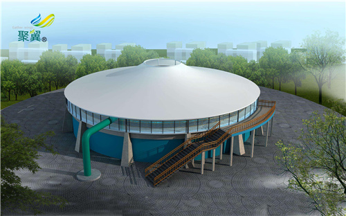 反吊膜結(jié)構(gòu)的應(yīng)用主要是在污水處理的調(diào)節(jié)池、初沉池及污泥濃縮池部分,一方面是因?yàn)閭鹘y(tǒng)的玻璃鋼在這種地方會(huì)受到腐蝕,另一方面是因?yàn)檫@種地點(diǎn)跨度較大,玻璃鋼的費(fèi)用較高。