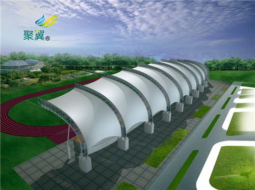 體育看臺造型美觀大方,空間跨度大,更好的體現了膜結構建筑空間跨度的優勢,而且施工周期短。膜結構正因為自身的優點,才使得它被廣泛的適用于大型體育場館、人口廊道、公園景觀小品、公眾休閑娛樂廣場、展覽會場、購物中心、汽車停車場等領域。