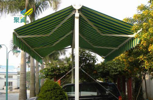 遮陽棚子采用高強度鋁合金制成的曲臂以及骨架,牢固抗風,收縮自如,使用壽命長達15年.昕景遮陽棚使用的遮陽布是由當今歐洲流行的聚丙烯晴綸制成,此材料耐光照、耐拉伸、耐腐蝕、耐寒冷、耐高溫、能抵抗任何環境氣候的影響,且防水、易干、質量特別穩。