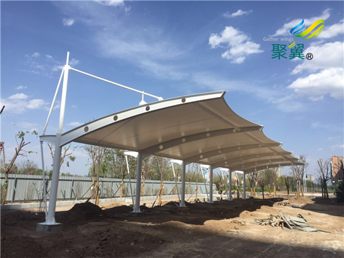 膜結構車棚的構造其實很簡單,主要是利用膜結構材料良好的張性覆蓋在支架上,是一種利用高強度膜結構的布和支架來搭建起來的簡單建筑, 膜結構車棚在安裝的時候要注意支承連接結構的穩定性,根據設計師設計制作出的圖像來計算膜結構的大小和膜結構停車棚的載荷。