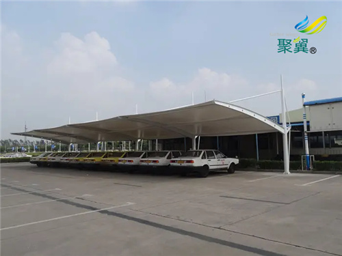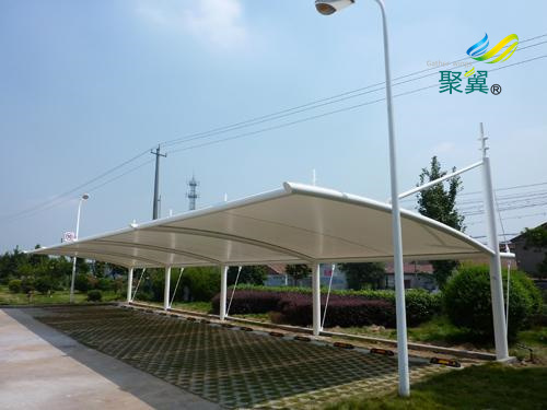 1.PVC膜材(PVC-Coated Polyester):PVC膜材在材料及加工上都比PTFE膜便宜,且具有材質柔軟,易施工的優點。但在強度、耐用年限、防火性等性能上較PTFE膜差。PVC膜材是由聚脂纖維織物加上PVC涂層(聚氯乙烯)而成,一般建筑用的膜材,是在PVC涂層材的表面處理上,涂以數micron厚的壓克力樹脂(acrylic),以改善防污性。但是,經過數年之后就會變色、污損、劣化。一般PVC膜的耐用年限,依使用環境不同在5~8年。為了改善PVC膜材的耐侯性,近年來已研發出以氟素系樹脂于PVC涂層材的表面處理上做涂層,以改善其耐侯性及防污性的膜材。