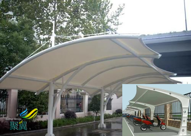 膜結構車棚是在超細玻璃纖維織物上涂以聚四氟乙烯樹脂而成的材料。這種膜材有較好的焊接性能,有優良的抗紫外線、抗老化性能和阻燃性能。