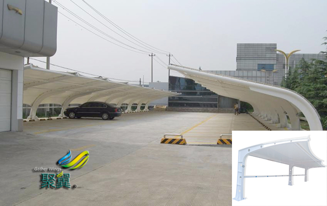 膜結構車棚具有自潔性,膜結構車棚的自潔性主要是膜材料表面加涂了防護層,防護層主要是聚氟乙烯、丙烯酸等構成可耐高溫,不會發粘,從而在落到膜材料的灰塵可依靠雨水或者自然風來達到自潔的特性。