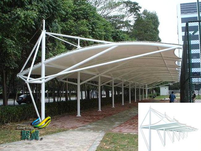 膜結構車棚藝術性:除了一般雨蓬不可比擬的實用、耐用、遮風擋雨的功能外,膜結構車棚雨蓬更是一座雕塑,一件藝術品,膜結構車棚給人美的視覺享受。